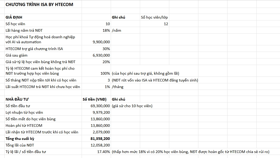 Khoản tiền đó được tính là đầu tư vào ISA khi có học viên nhập học, khi này hợp đồng được chuyển thành hợp đồng 3 bên, trong đó Học viên vay của nhà đầu tư để trả cho bên đào tạo là công ty cổ phần công nghệ HTECOM. Lúc này HTECOM mới được quyền thụ hưởng số tiền đầu tư chuyển thành học phí.